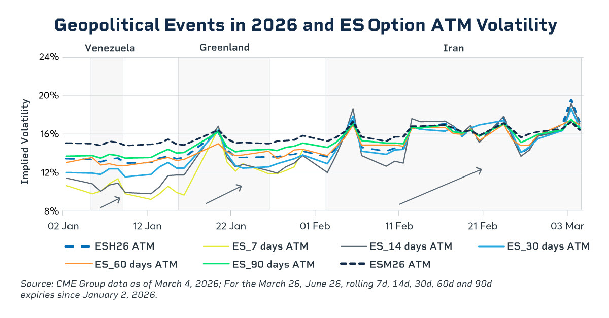 Any shifts in geopolitical flashpoints can affect market sentiment and lead to repositioning as investors respond tactically. This dynamic was evident in January, when short-dated at-the-money (ATM) implied volatility in E-mini S&P 500 (ES) options – as represented on a rolling seven-day basis – rose from 9.75% to 11.31% (+1.57%) in response to U.S. action in Venezuela. Similarly, that same volatility metric spiked from 10.49% to 16.50% (+6.01%) following U.S.-EU trade tensions over Greenland.