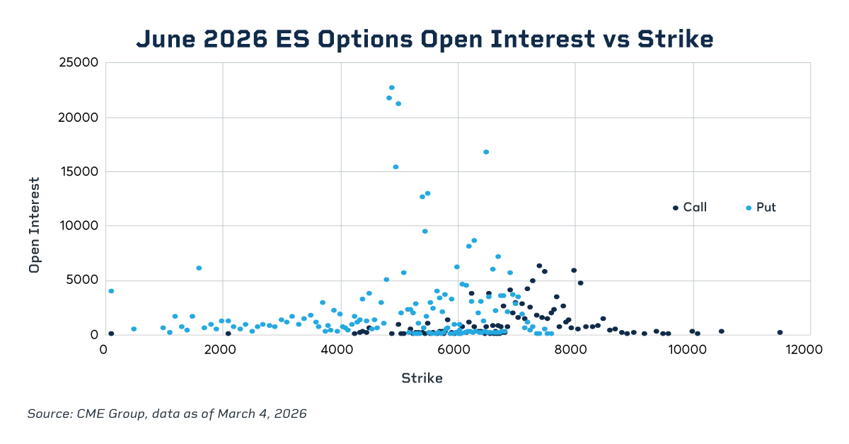 As of March 4, the market positioning for the June maturity indicates that some traders are preparing for potential volatility by establishing deep out-of-the-money (OTM) hedges at the 4850 and 5000 level, indicating increased institutional demand for downside protection following the geopolitical developments this year. Conversely, bullish speculators are targeting a move toward the 7400–8100 range.