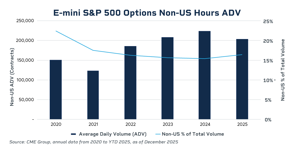 Given the density of events that have occurred only a few weeks into 2026, the ability to adjust exposures in real time – during U.S. and non U.S. trading hours – remains critical for investors. The average daily volume for Equity Index options outside of U.S. trading hours reached over 200,000 contracts as of December 2025, accounting for 16% of the total daily Equity options volume, as global institutions increasingly manage their risk around the clock.