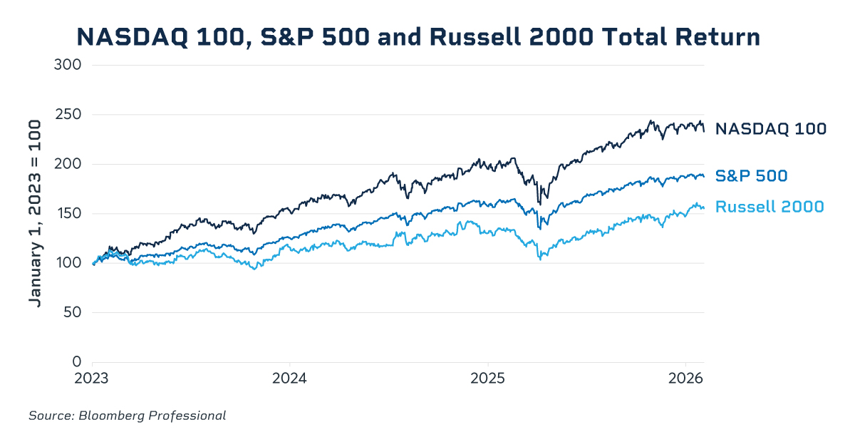 In early 2023, the Nasdaq Composite began what would become a historic rally, surging 145% in less than three years. The advance was remarkable not just for its magnitude, but for its narrow leadership. A small group of mega-cap technology companies, particularly those at the forefront of the AI evolution, drove the bulk of the gains.