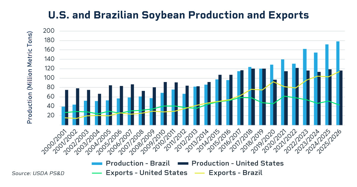 While the U.S. has exported between 30% and 50% of its production since 2000, Brazil regularly exports the majority of its crop, with shipments expected to surpass 64% of production in the 2025/2026 marketing year. For the U.S., the export share of production is expected to fall to just under 37% in 2025/2026, from more than 43% the year prior. Brazilian exports are so great that in the current crop year, Brazilian exports (115 million MT) are projected to fall just shy of total U.S. production (115.9 million MT).
